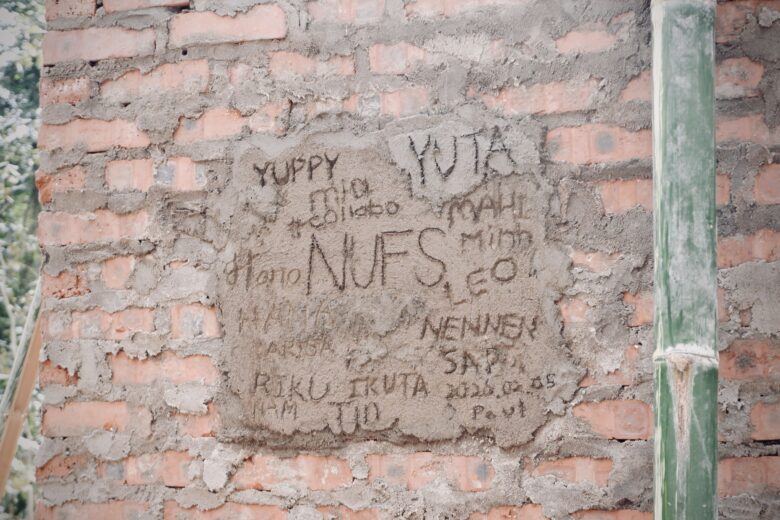 レンガを積み重ねてトイレの壁を作っている様子。人数にもよりますが、トイレ作りには4日間ほどかかります。