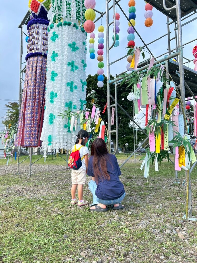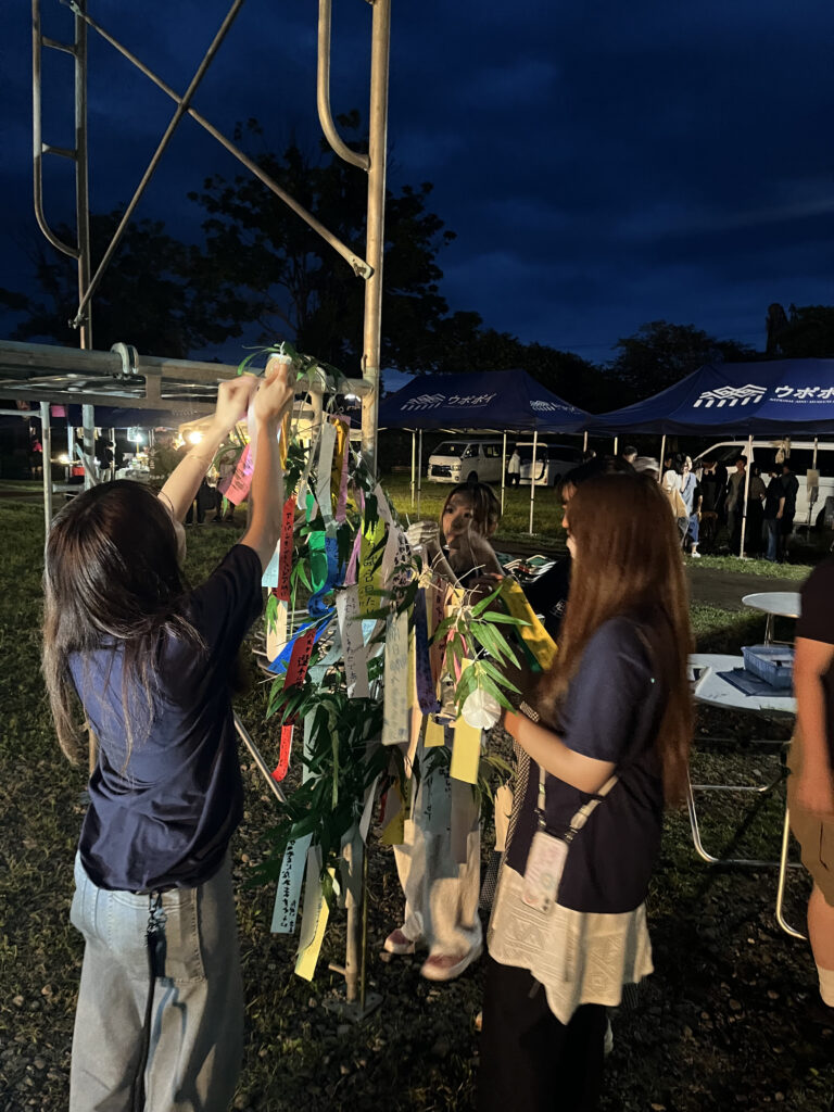 白老町の人はみんな優しい人たちばかりだなと感じていたけど、ここにきてもやっぱり人の温かさを実感した。お店の人とお客さんの関係を見ていてもそうだし、私たち大学生を暖かく出迎えてくれた。お隣さんから、ポップコーン、ベビーカステラ、団子、フランクフルト、オショロコマなどなどこれ以上にたくさん差し入れいただきました。私たちメンバーもいい顔してたなほんとに!地元の小さい子から年配の方たちまでいろんな世代の方々とお話ができて、楽しかったの一言に尽きます。ウポポイの隣ということで、外国人観光客の方もちらほら見えました。数週間ぶりに私となごみんと先生で英会話に挑戦してみたり、最後短冊にお願い書きまくってみたりとお祭りはいい感じに終わって、夜は2回目のウポポイ近くにある温泉にチャリでいって、最後は雨に降られたけどほんとにいい一日だったなあ。