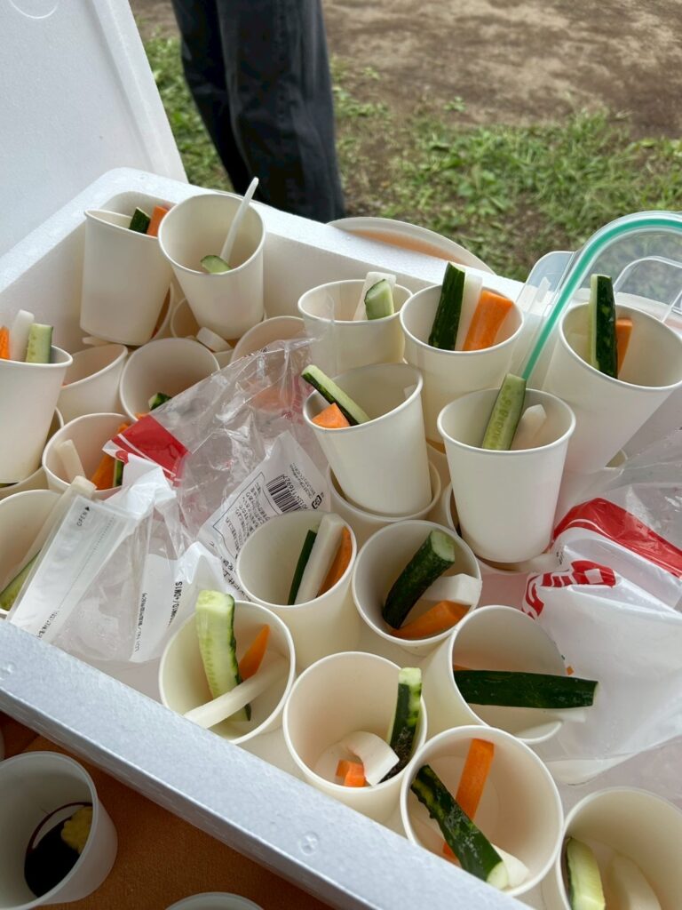地元の人からは「このお味噌かえないの?」「もう一個もらっていい?」というような嬉しいお言葉沢山もらえました。「つけてみそかけてみそ」の評判があまりにも良くて、自分は回し者でも何でもないけど、ちょっぴり製造者の気分に。愛知県民として少し誇らしげに感じられた。自分の身近にあるからこそ気づけない魅力に気づくことができた。さらに、大人だけではなく子供にも野菜スティック受けてそれが結構意外だった。事前研修から何をすれば地元の人たちに楽しんでもらえるのかを考えていて、前日の夜には、地元の人に頂いた大量のお野菜、きゅうり100本、大根2,3本、セロリと人参20本くらいをみんなで仕込みました。