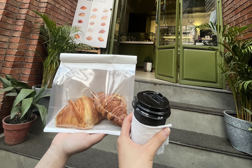 ホテルへ帰る途中、美味しそうなクロワッサンを見つけて立ち寄りました。「Bro Bakery」でクロワッサンを2つとカフェラテを購入。