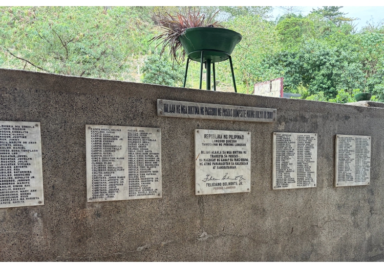 その後、犠牲になった方々の記念碑を見学しました。発見された方の名前が刻まれており、未発見の方を含めると約1,000人が犠牲になったと言われているそうです。