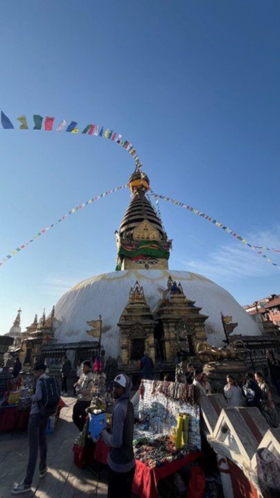 この寺院にたどり着くまでは400段ほどの急な階段を上る必要があり大変でしたが、400段を上り終え、間近でみたスワヤンブナートは美しくとても感動しました。また、頂上から眺める景色は素晴らしくカトマンズの広大な街を一望することができたことも良い思い出です。そして、この寺院を上るときに驚いたことが猿の多さでした。後から調べたことですが、その猿の多さから別名モンキー・テンプルとも呼ばれるそうです。日本の寺院とは違うカラフルな寺院で異国を感じられたことが幸せな時間でした。